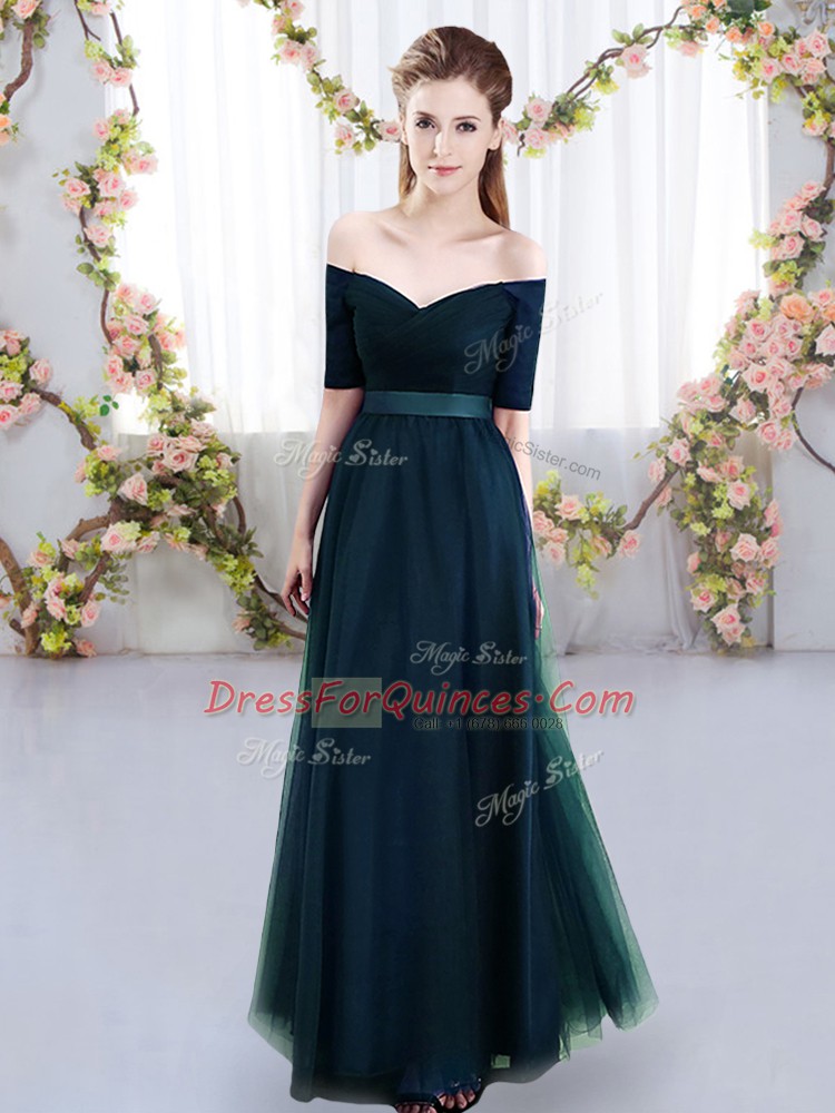 Navy Blue Quinceanera Court Dresses Prom and Party and Wedding Party with Ruching Off The Shoulder Short Sleeves Lace Up