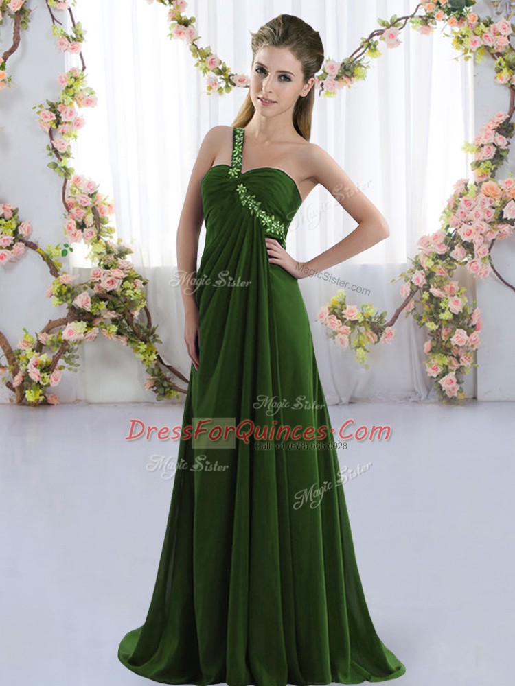 Olive Green Vestidos de Damas Prom and Party and Wedding Party with Beading One Shoulder Sleeveless Brush Train Lace Up