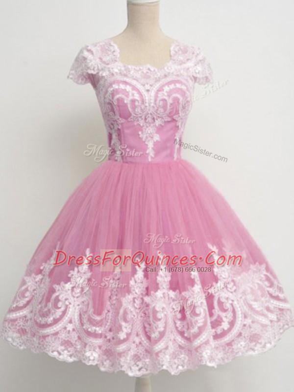 Rose Pink Zipper Dama Dress Lace Cap Sleeves Knee Length