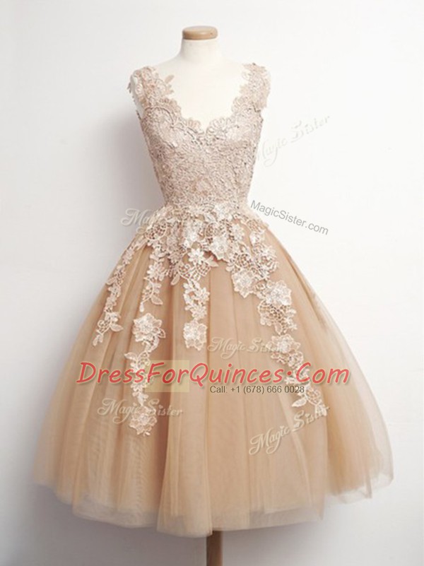 Sleeveless Lace Up Knee Length Appliques Quinceanera Court Dresses
