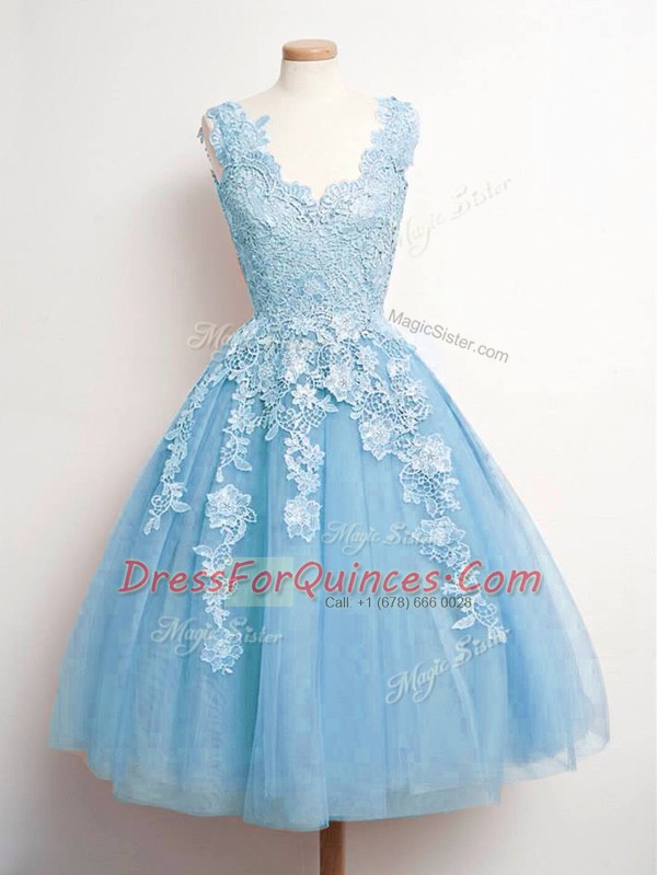 Sleeveless Tulle Knee Length Lace Up Quinceanera Dama Dress in Baby Blue with Lace