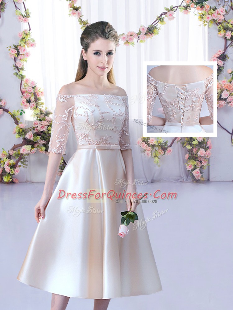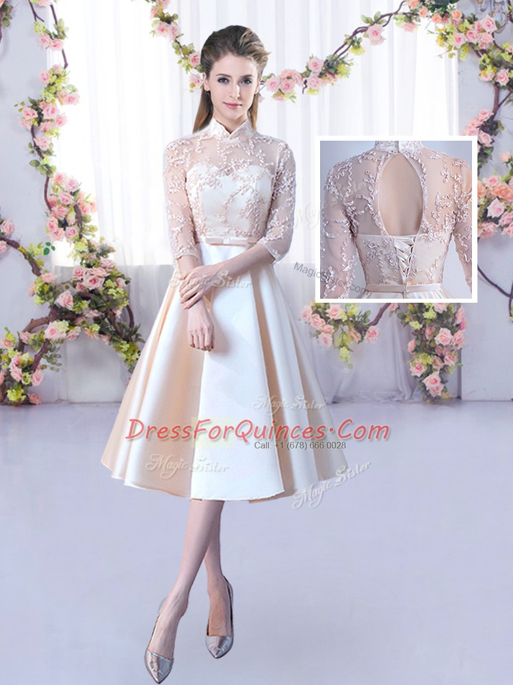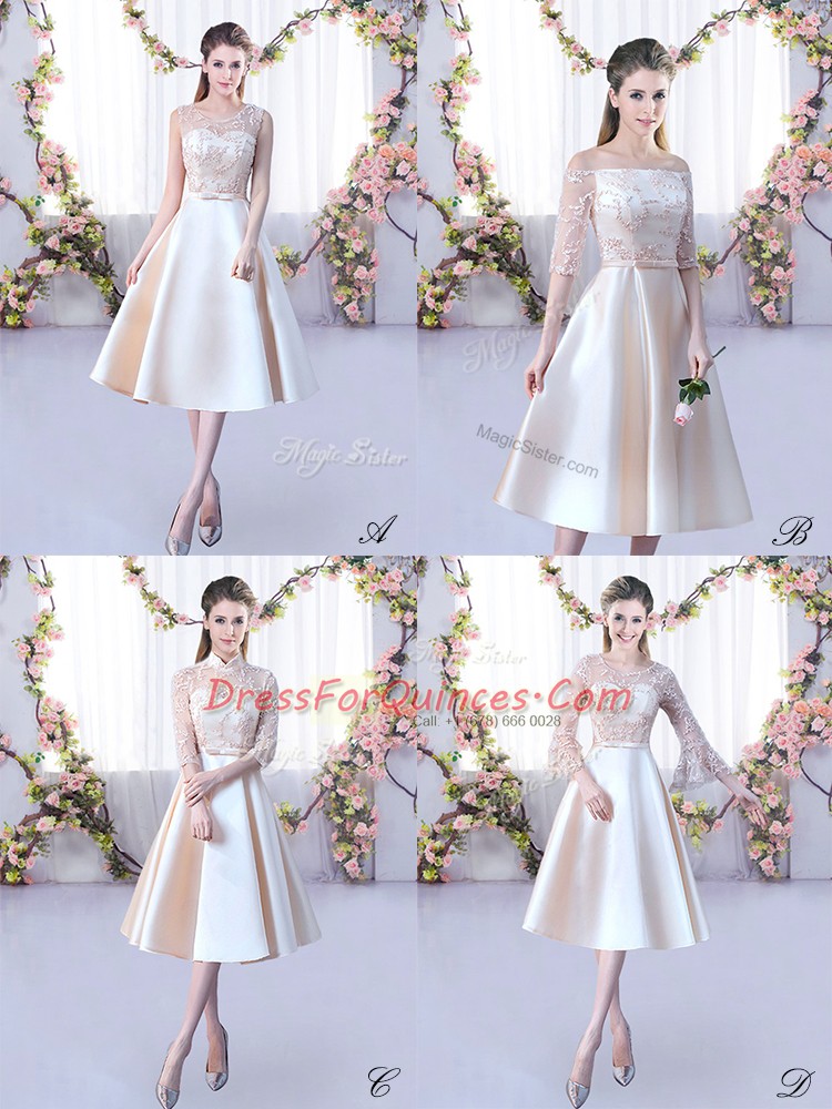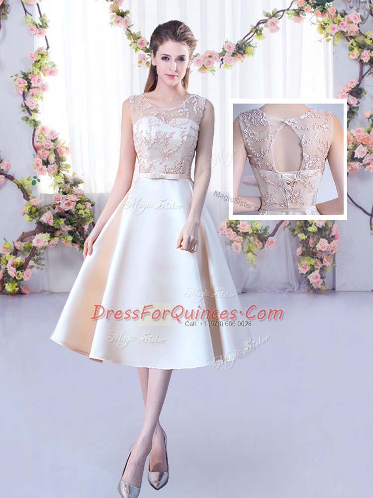 Spectacular Satin Sleeveless Tea Length Court Dresses for Sweet 16 and Lace and Belt