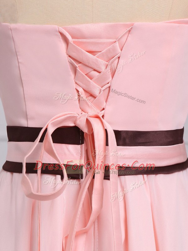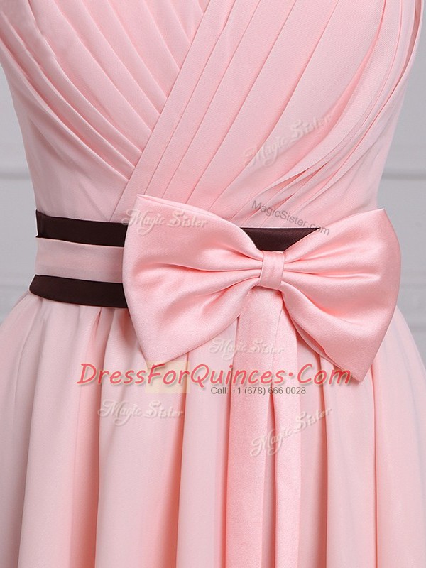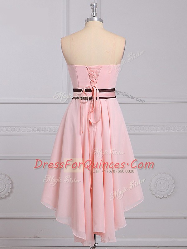 Strapless Sleeveless Quinceanera Court Dresses High Low Ruching and Bowknot Baby Pink Chiffon