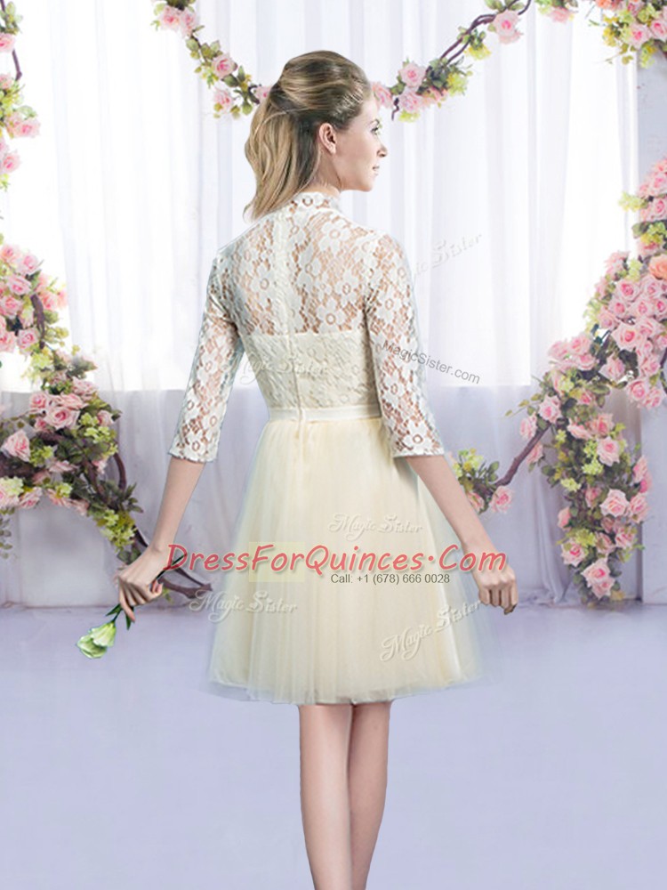 Stunning Half Sleeves Tulle Mini Length Lace Up Quinceanera Dama Dress in Champagne with Bowknot