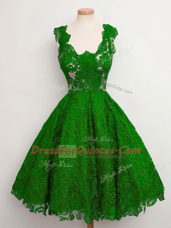 Sweet A-line Vestidos de Damas Green Straps Lace Sleeveless Knee Length Lace Up