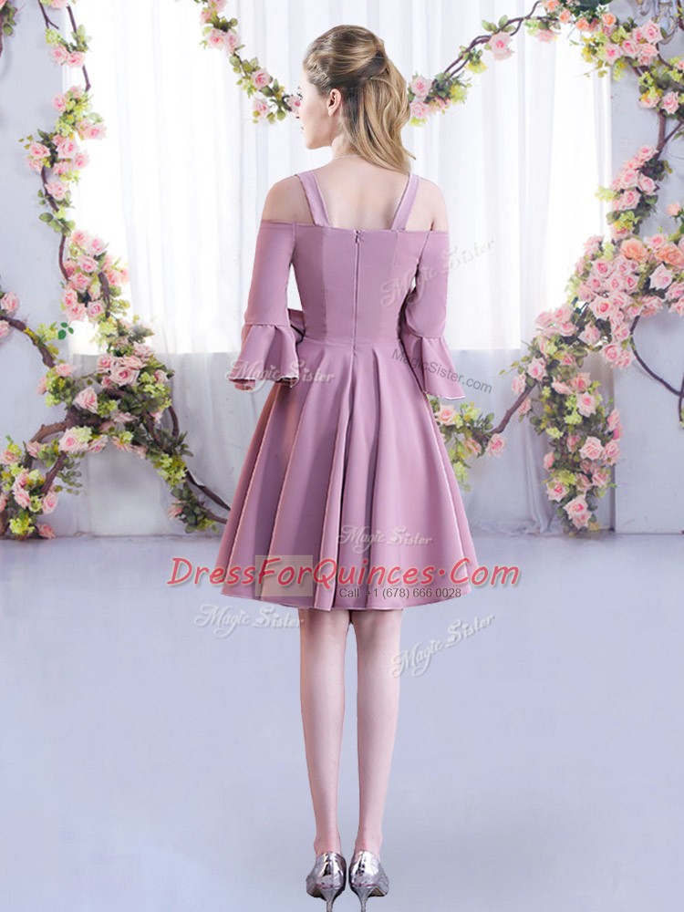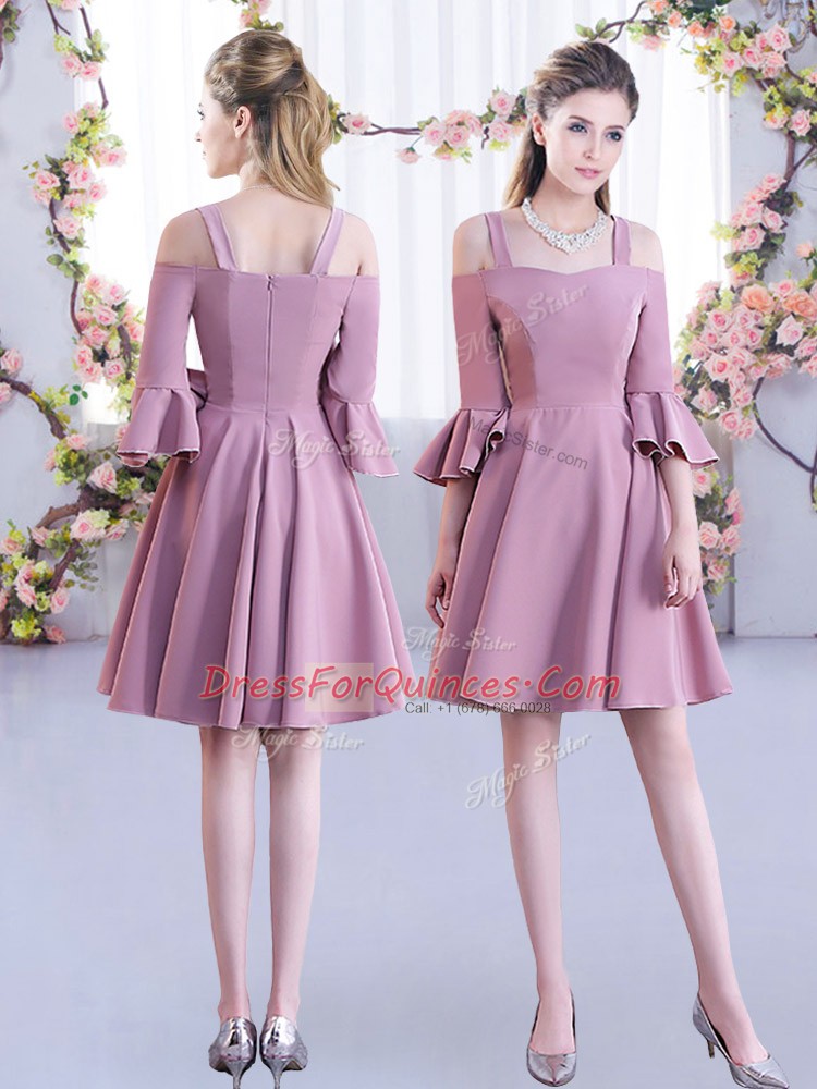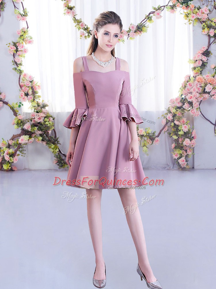 Unique Pink Quinceanera Court of Honor Dress Wedding Party with Ruching Off The Shoulder Half Sleeves Zipper