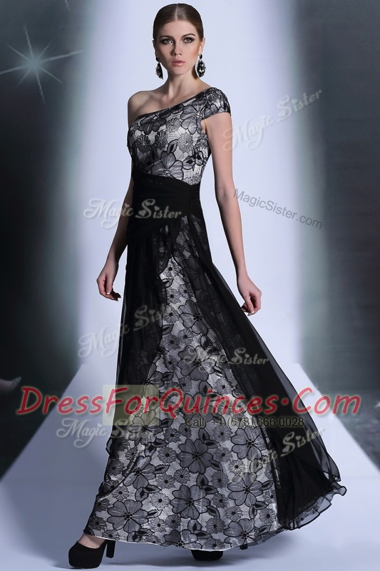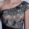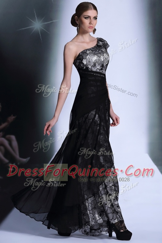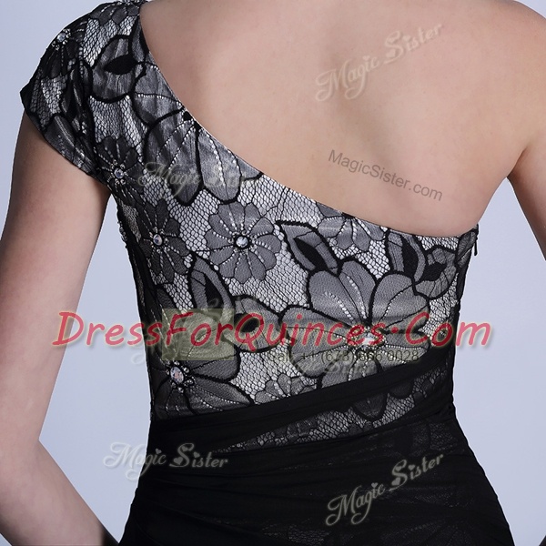 Attractive Black Side Zipper One Shoulder Embroidery Prom Dress Tulle and Lace Sleeveless