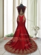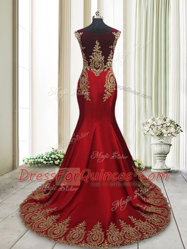 Attractive Mermaid Scoop Cap Sleeves Elastic Woven Satin With Brush Train Side Zipper Prom Dress in Red with Appliques