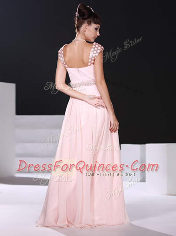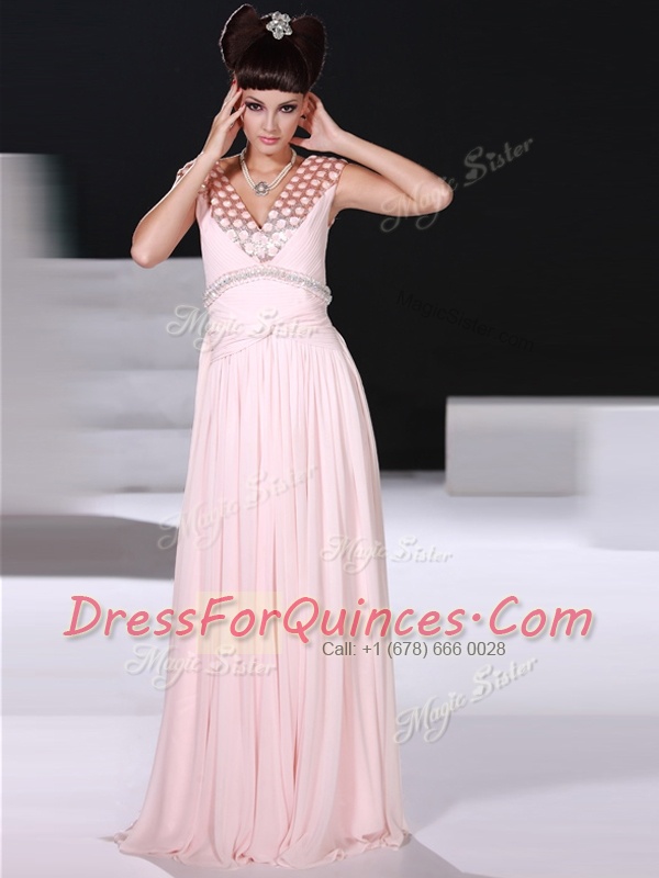 Baby Pink Column/Sheath V-neck Sleeveless Chiffon Floor Length Zipper Beading Prom Gown