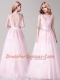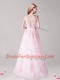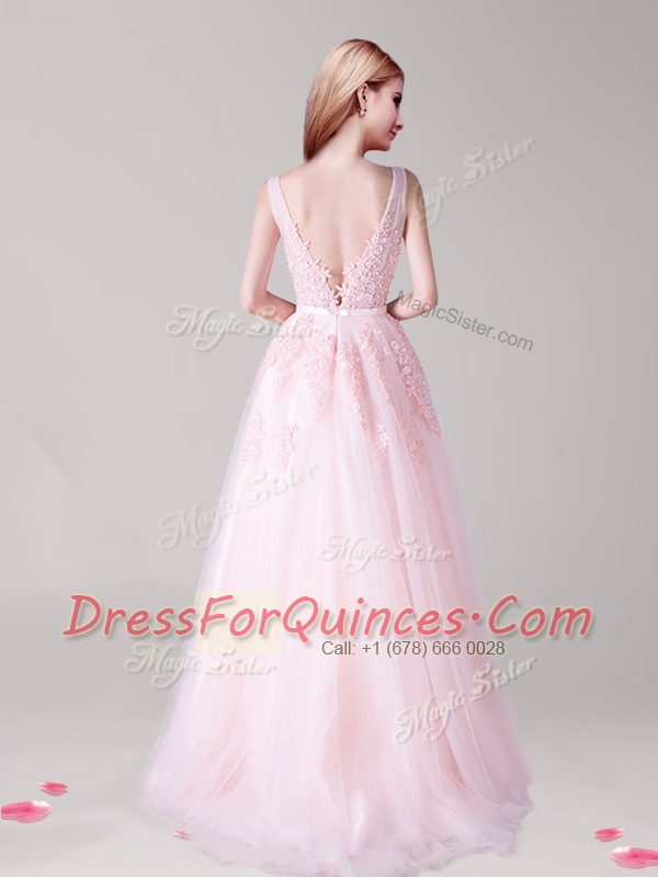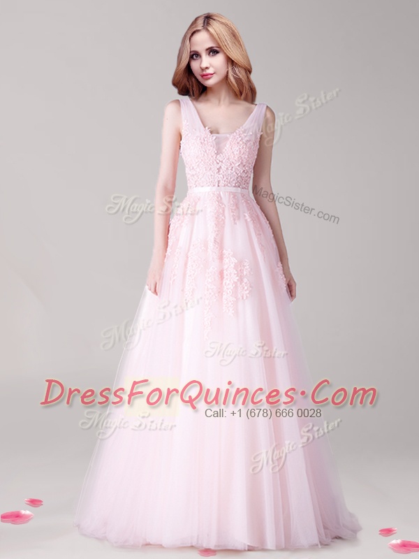Baby Pink Prom Gown Prom and For with Appliques and Belt V-neck Sleeveless Backless