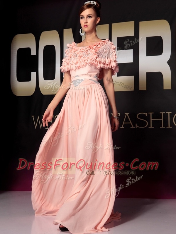 Baby Pink Short Sleeves Chiffon Side Zipper Prom Dresses for Prom and Party