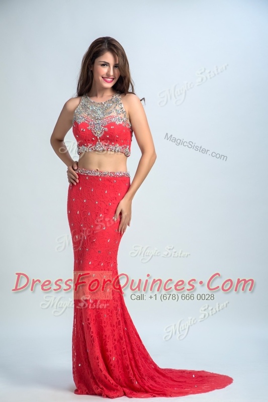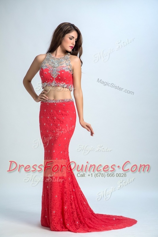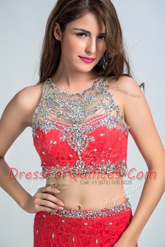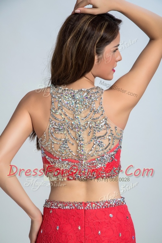 Clearance Mermaid Scoop Coral Red Sleeveless With Train Beading Zipper Prom Gown