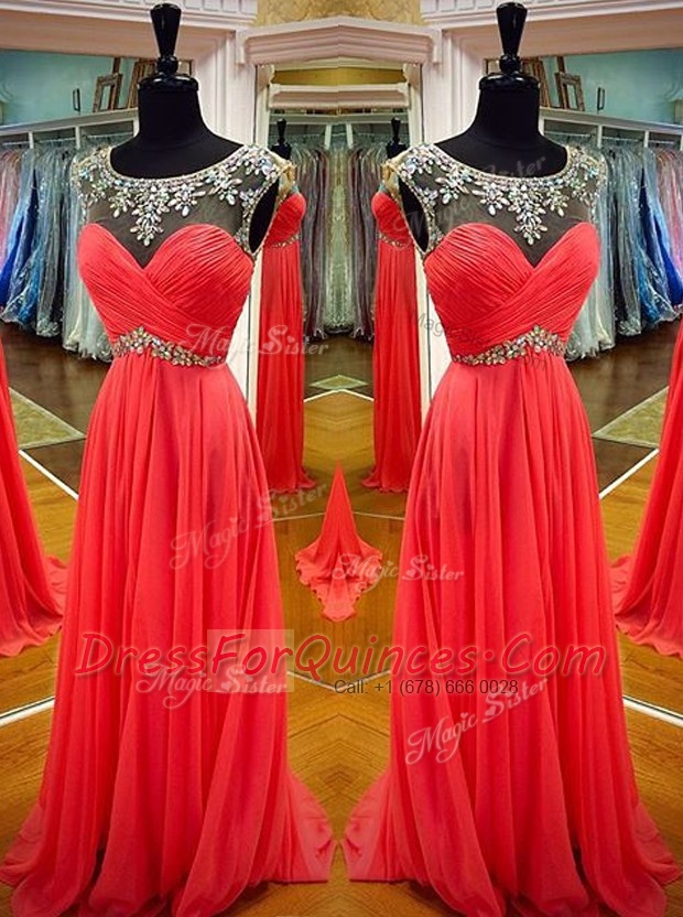 Custom Design Scoop Backless Coral Red Sleeveless Sashes ribbons Floor Length Prom Dresses
