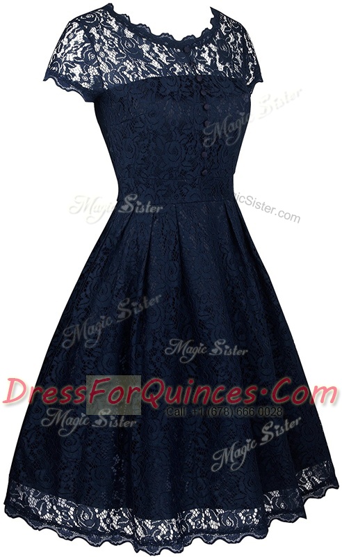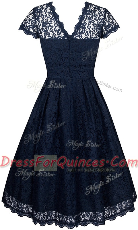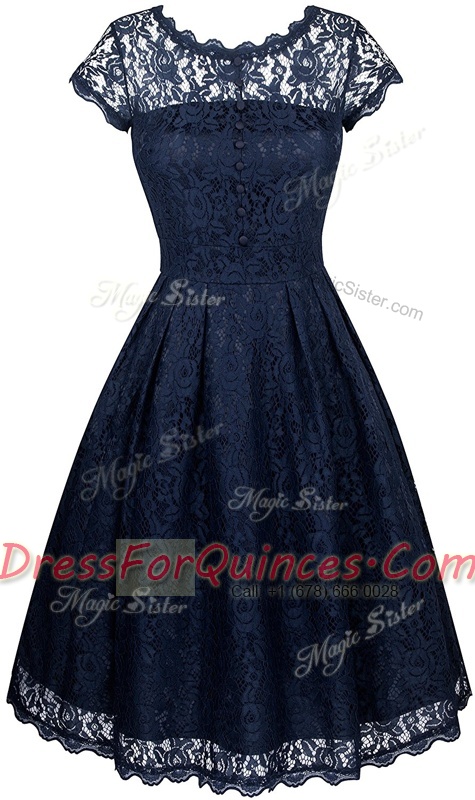 Custom Fit Navy Blue Empire Organza Scalloped Short Sleeves Lace Tea Length Zipper Prom Party Dress