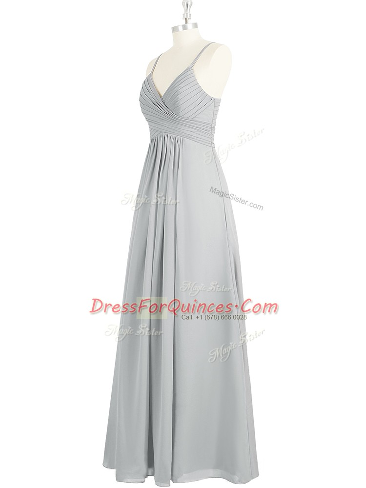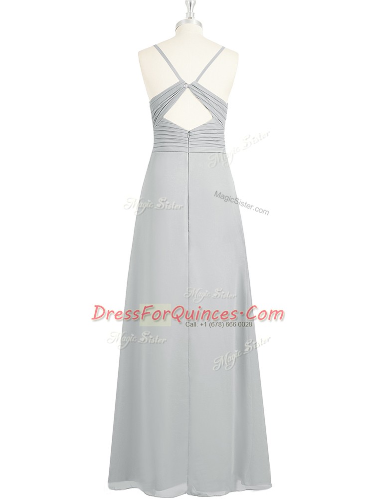 Customized Chiffon Spaghetti Straps Sleeveless Backless Ruching Prom Party Dress in Grey