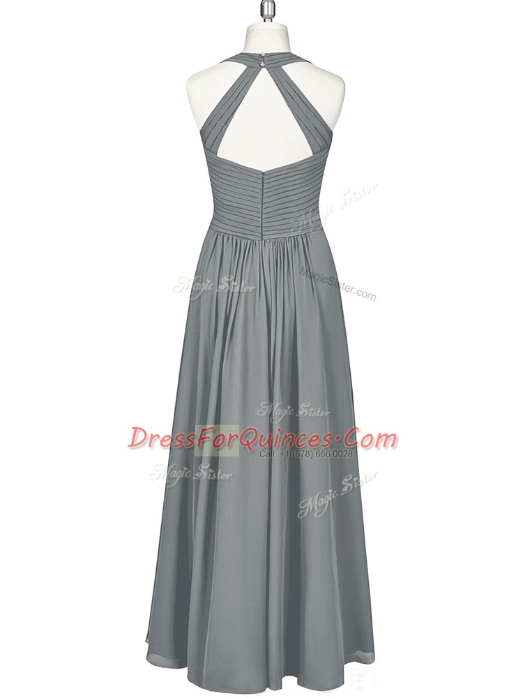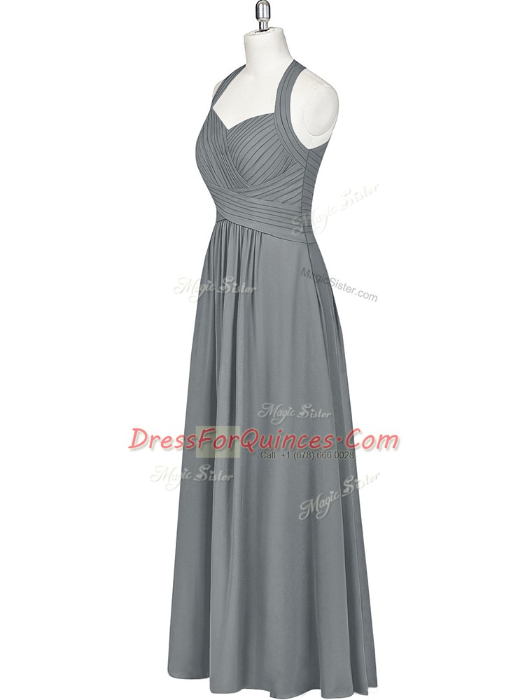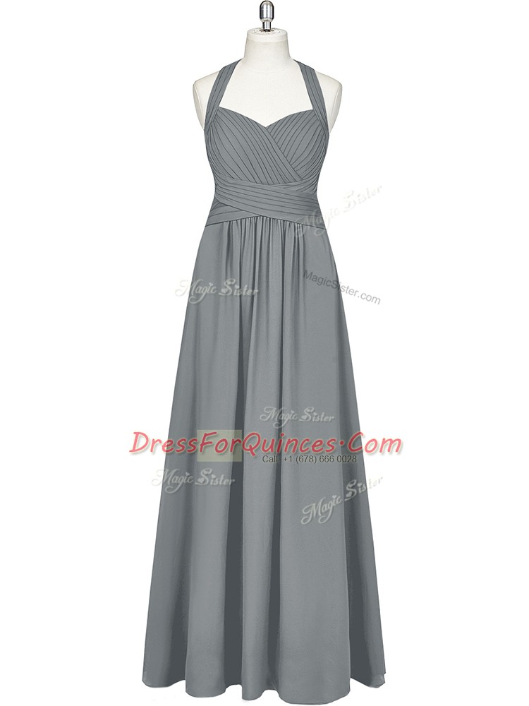 Customized Sleeveless Floor Length Ruching Zipper Prom Gown with Grey