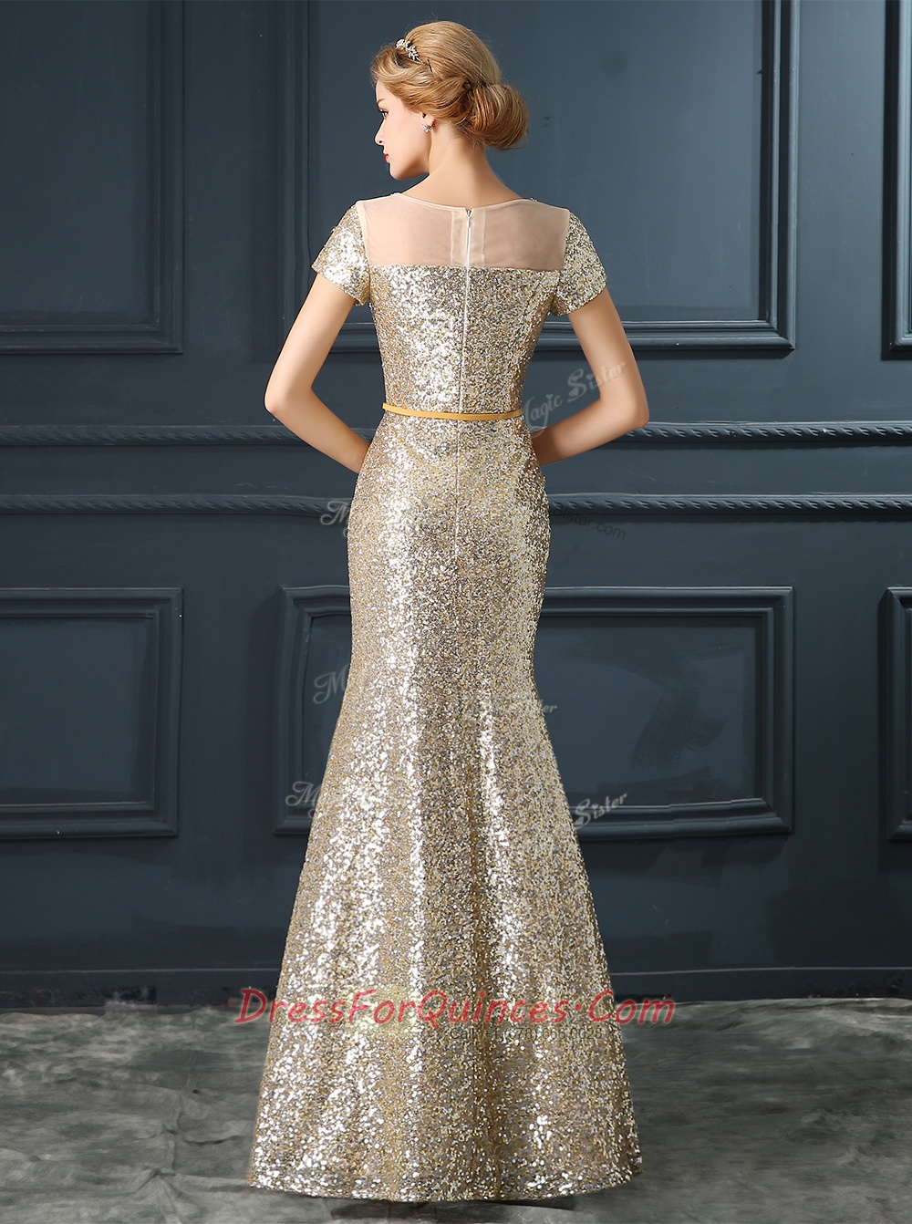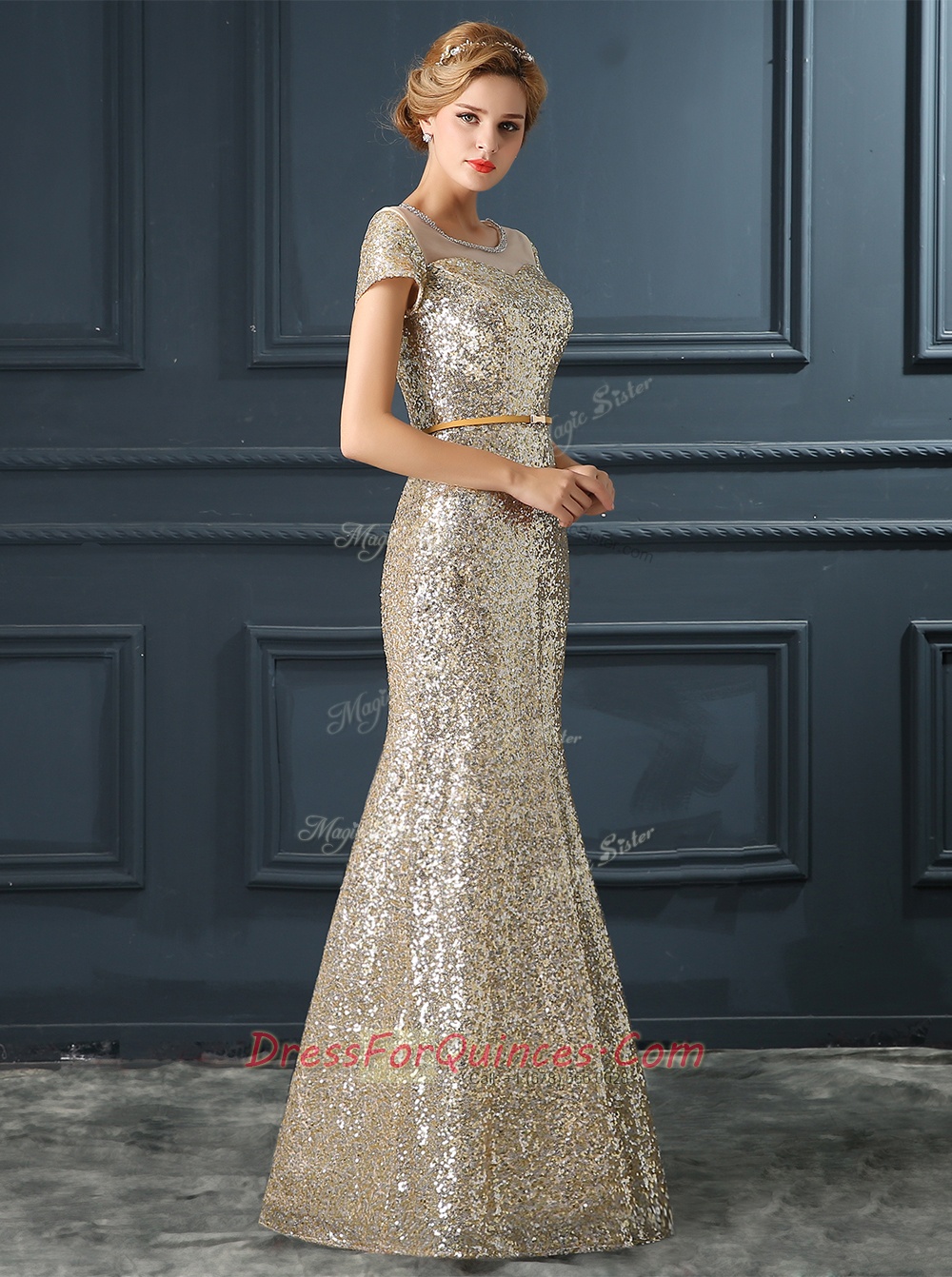 Cute Mermaid Scoop Cap Sleeves Evening Dress Floor Length Sequins and Belt Champagne Sequined