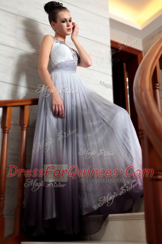 Cute Multi-color Column/Sheath Chiffon V-neck Sleeveless Beading and Appliques and Ruching Floor Length Side Zipper Evening Dress