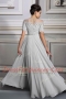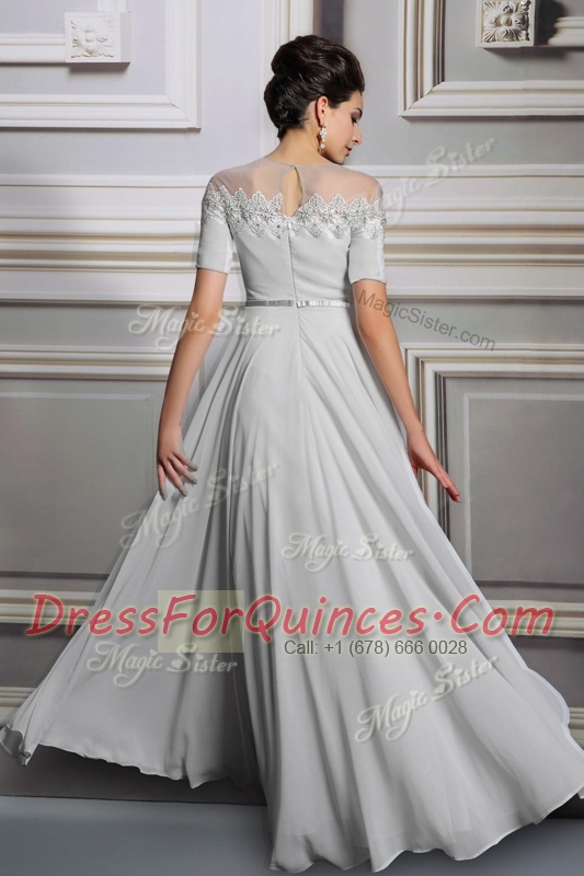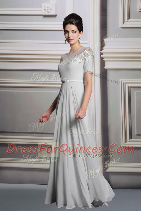 Edgy Scoop Silver Empire Appliques and Belt Prom Dress Zipper Satin Short Sleeves Floor Length