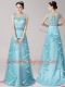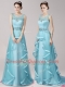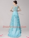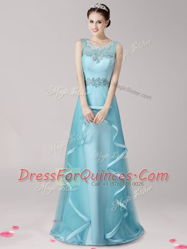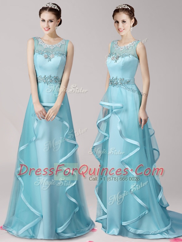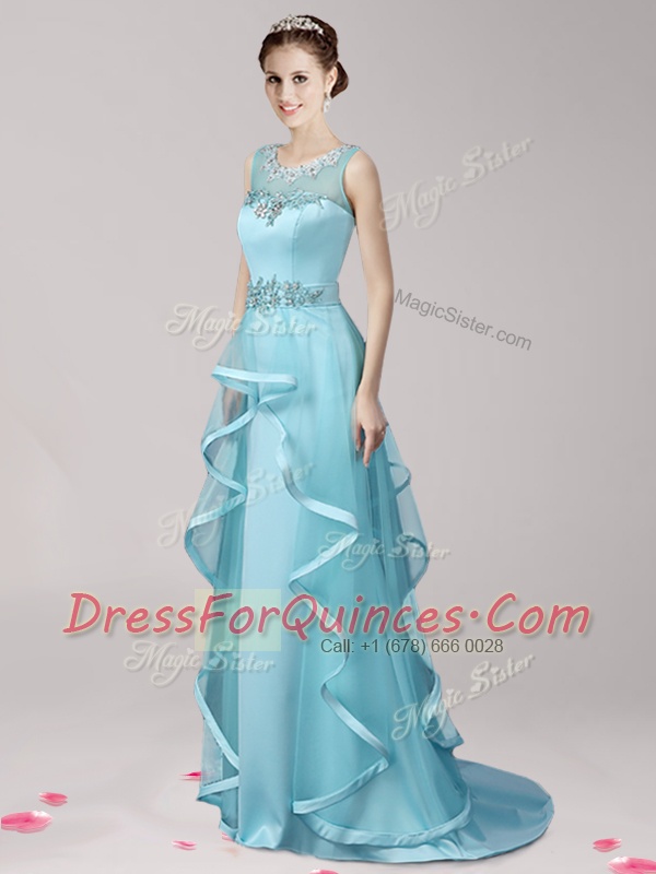 Elegant Scoop Aqua Blue Sleeveless Brush Train Appliques and Ruffles With Train Prom Evening Gown