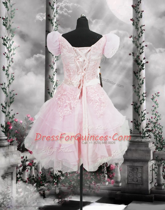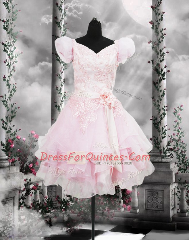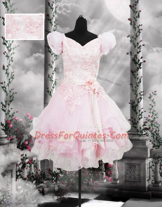Gorgeous Short Sleeves Knee Length Beading and Appliques and Ruffles and Hand Made Flower Lace Up Prom Gown with Baby Pink