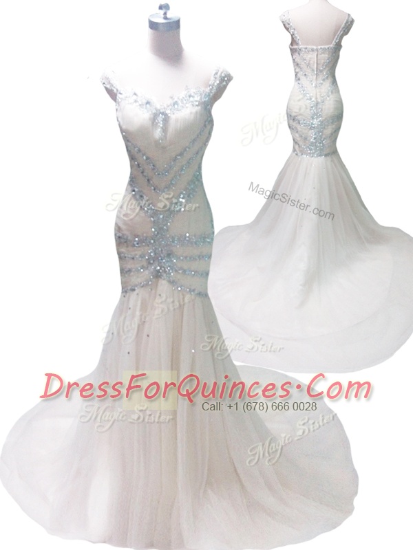 Graceful Mermaid Straps Sleeveless Tulle With Train Court Train Zipper Prom Gown in White with Beading
