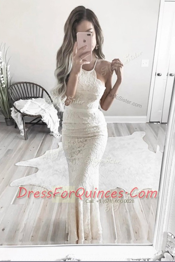 Great Halter Top White Mermaid Lace Dress for Prom Zipper Lace Sleeveless Floor Length