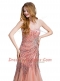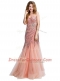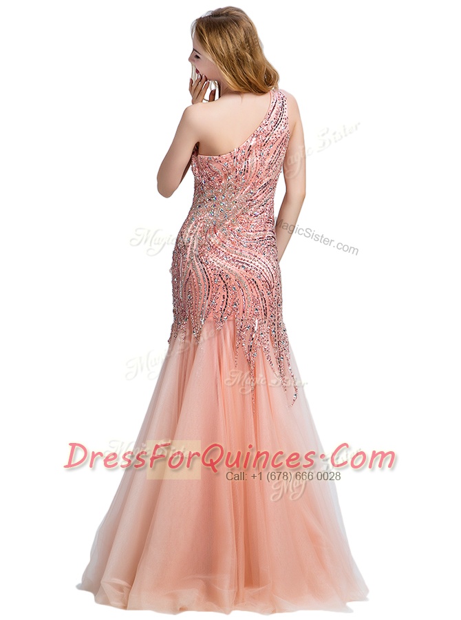 Great One Shoulder Peach Mermaid Beading Prom Party Dress Side Zipper Tulle Sleeveless Floor Length
