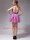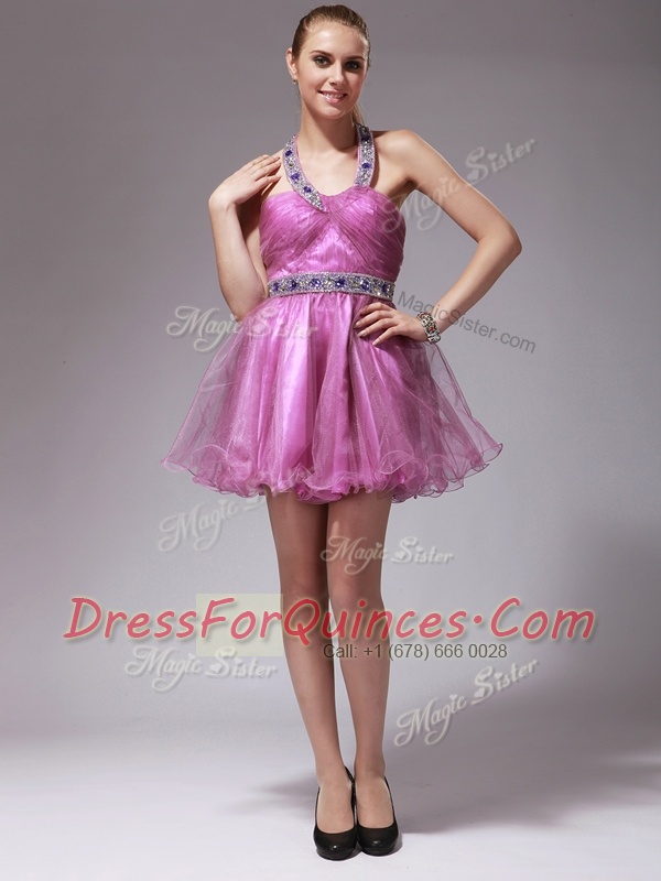 Halter Top Sleeveless Organza Mini Length Zipper Evening Dress in Rose Pink with Beading