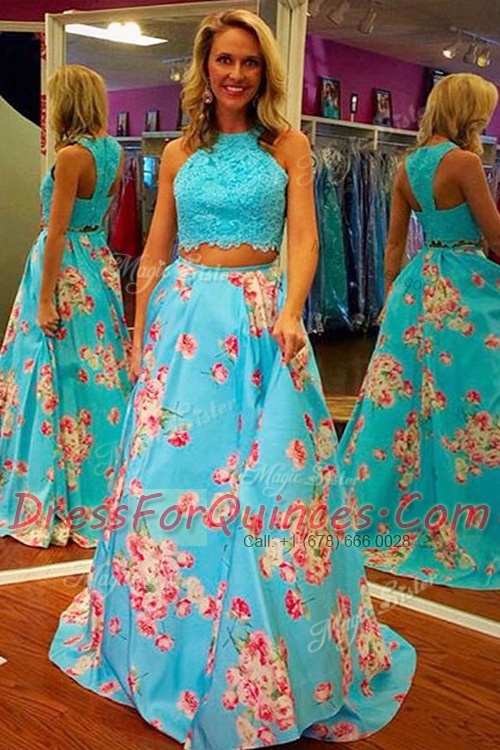 Halter Top Sleeveless Sweep Train Zipper Aqua Blue Satin
