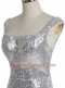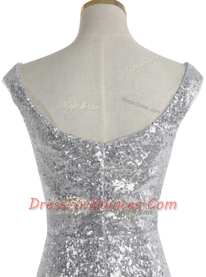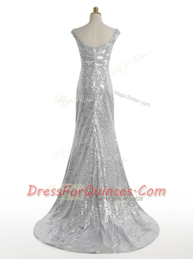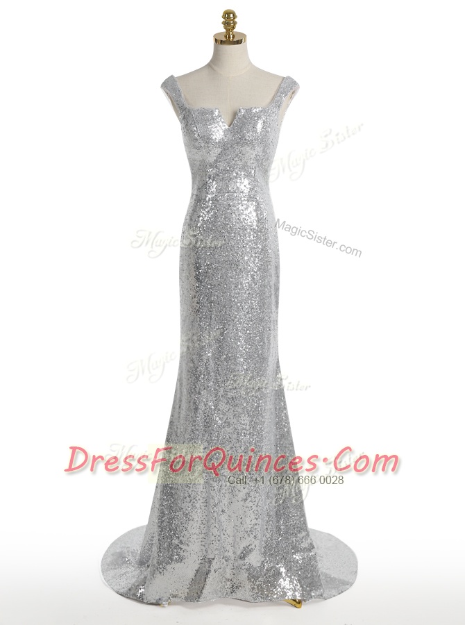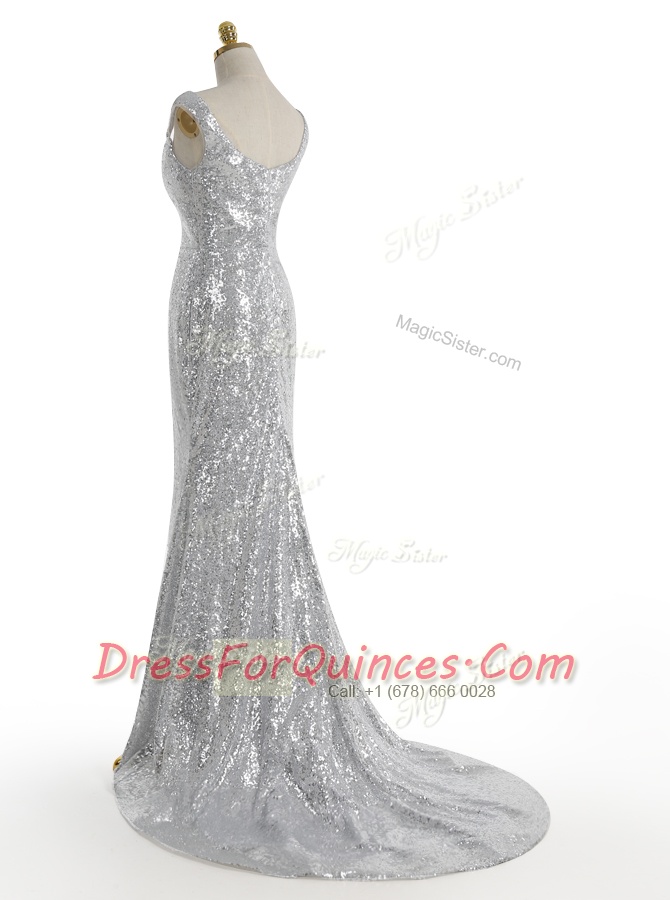 Mermaid Silver Zipper Square Sequins Evening Dress Sequined Sleeveless Sweep Train