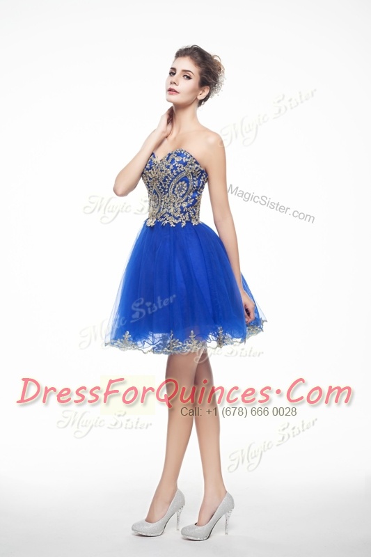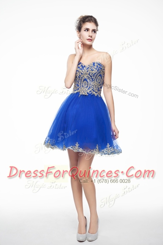 Mini Length Royal Blue Prom Gown Organza Sleeveless Beading and Embroidery