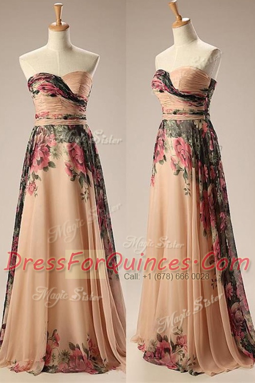 Most Popular Champagne Chiffon Zipper Strapless Sleeveless Floor Length Dress for Prom Embroidery