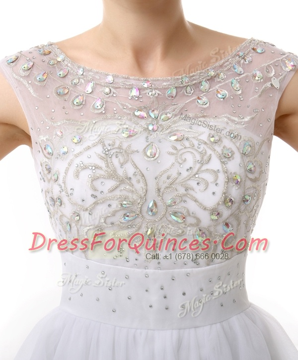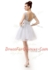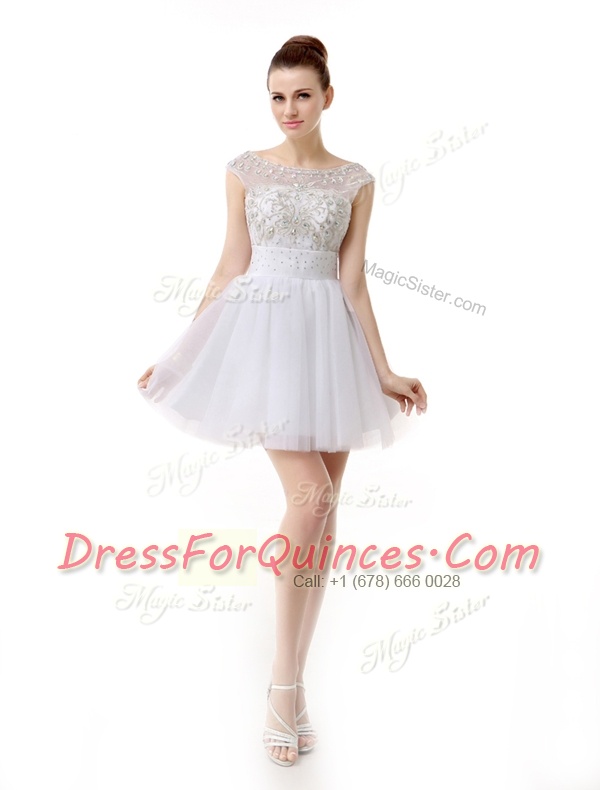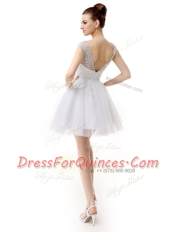 New Style Scoop Cap Sleeves Prom Party Dress Mini Length Beading and Ruching White Organza