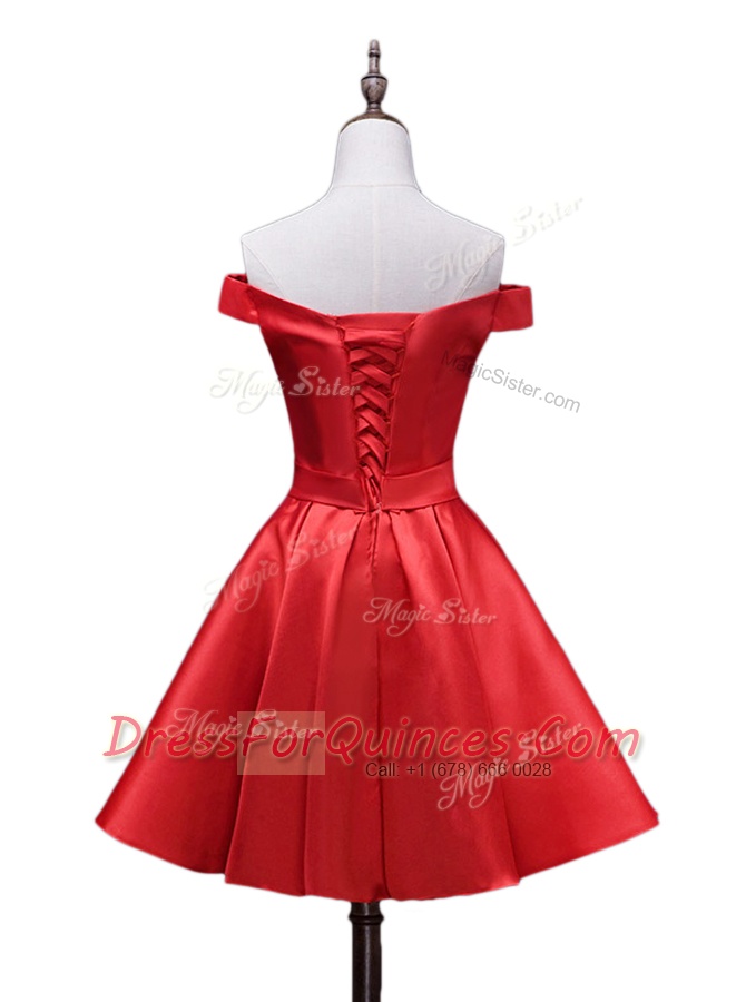 Off the Shoulder Knee Length Red Prom Dresses Satin Sleeveless Bowknot