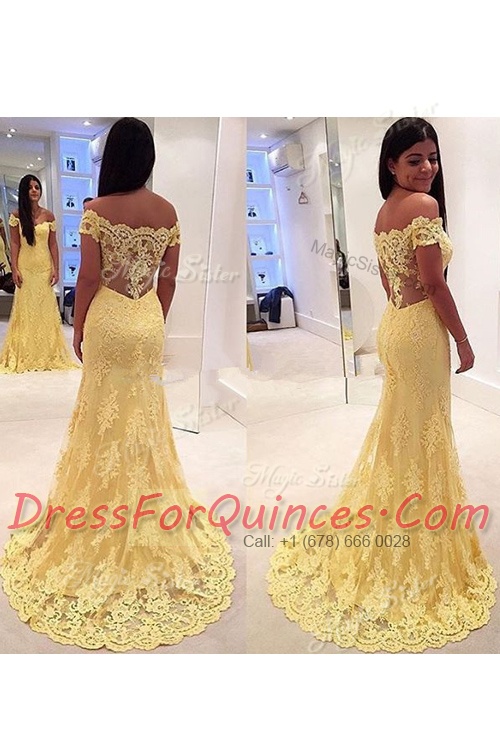 Off the Shoulder Lace Sleeveless With Train Dress for Prom Brush Train and Lace