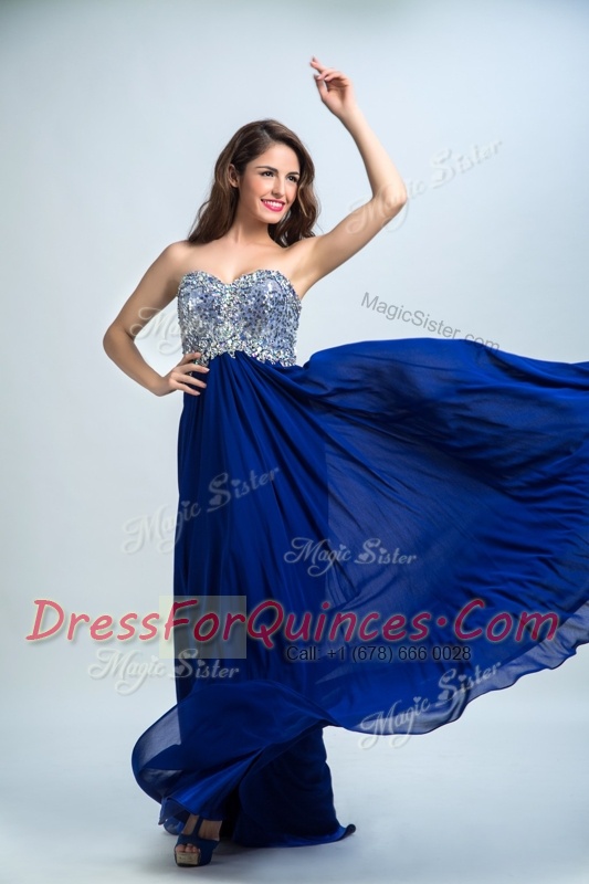 Royal Blue Sleeveless With Train Beading Zipper Prom Party Dress
