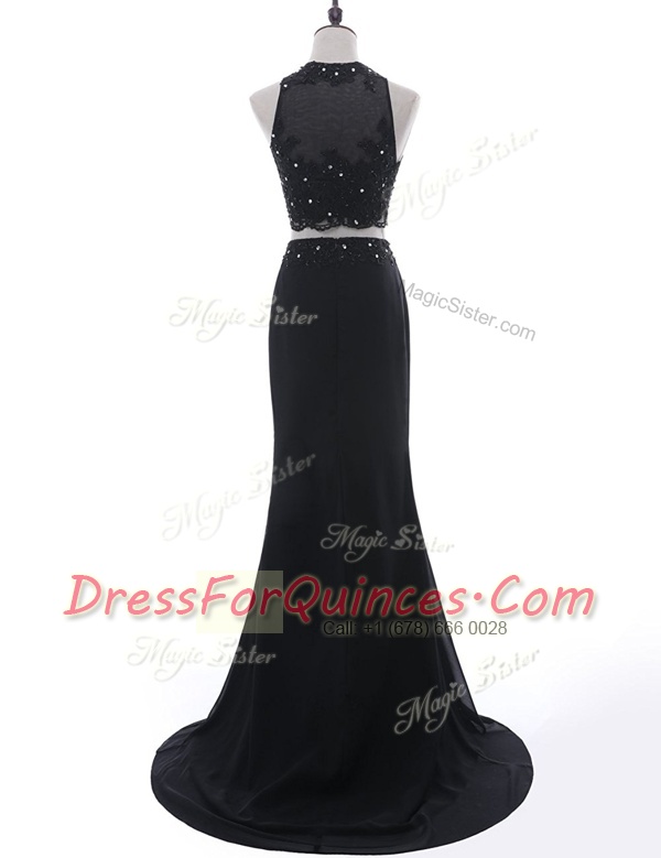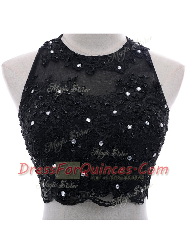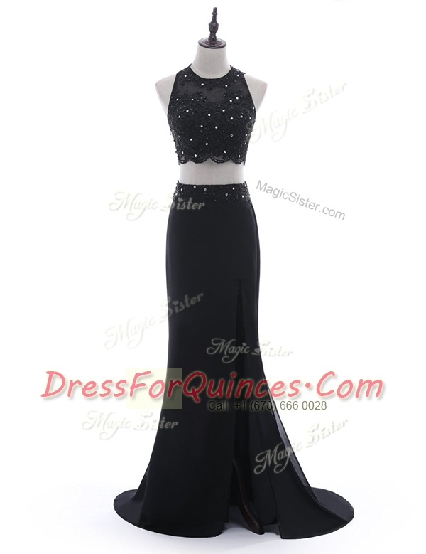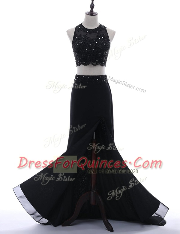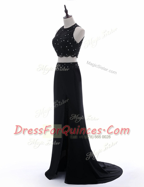 Scoop Black Sleeveless With Train Beading and Lace Side Zipper Dress for Prom