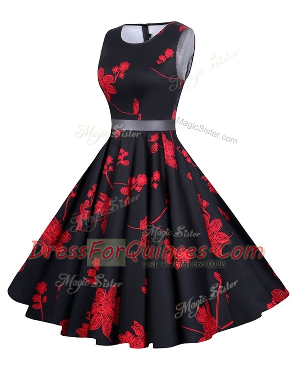 Scoop Knee Length Zipper Prom Dress Red And Black for Prom and Party with Sashes ribbons and Pattern