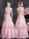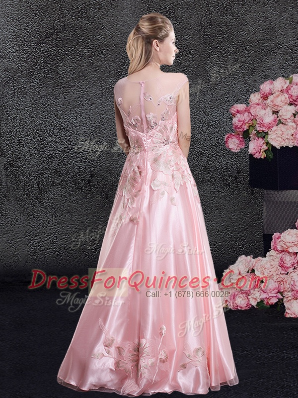 Scoop Organza Cap Sleeves Floor Length Prom Dresses and Appliques