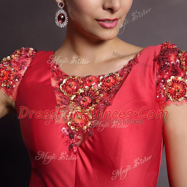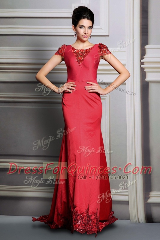 Scoop Short Sleeves Court Train Clasp Handle Prom Evening Gown Red Satin