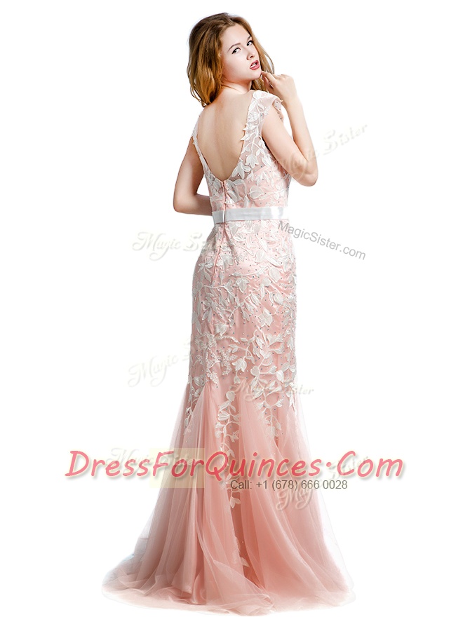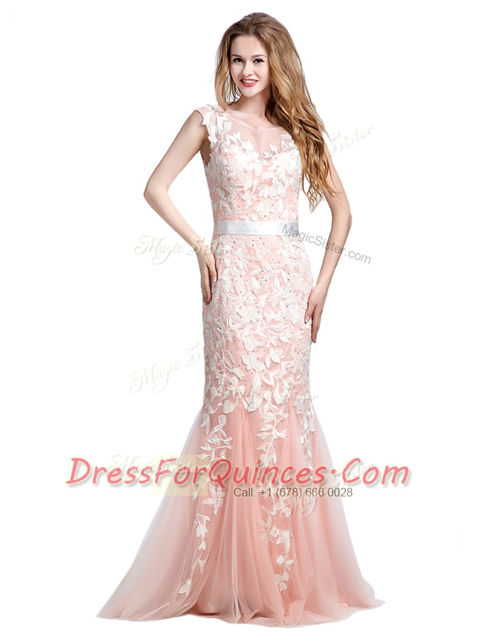 Scoop With Train Column/Sheath Cap Sleeves Pink Prom Dresses Brush Train Zipper