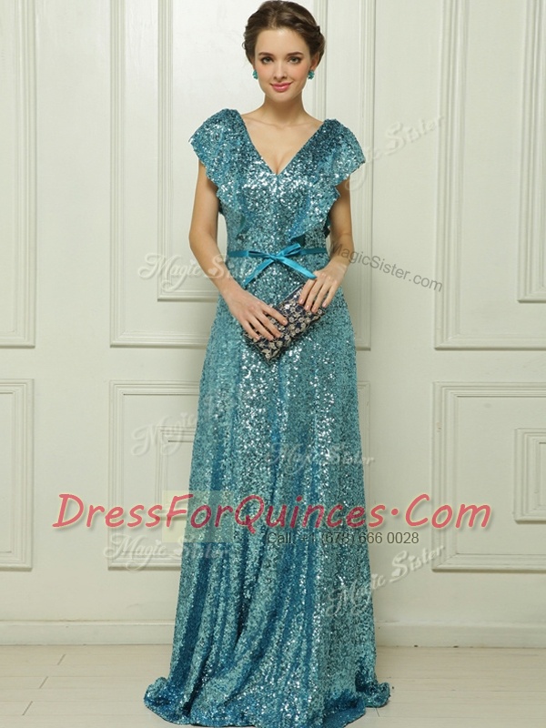 Sequined V-neck Sleeveless Zipper Sequins and Bowknot Evening Dress in Teal