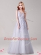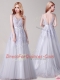 Silver A-line V-neck Sleeveless Tulle Floor Length Backless Appliques and Belt Evening Dress