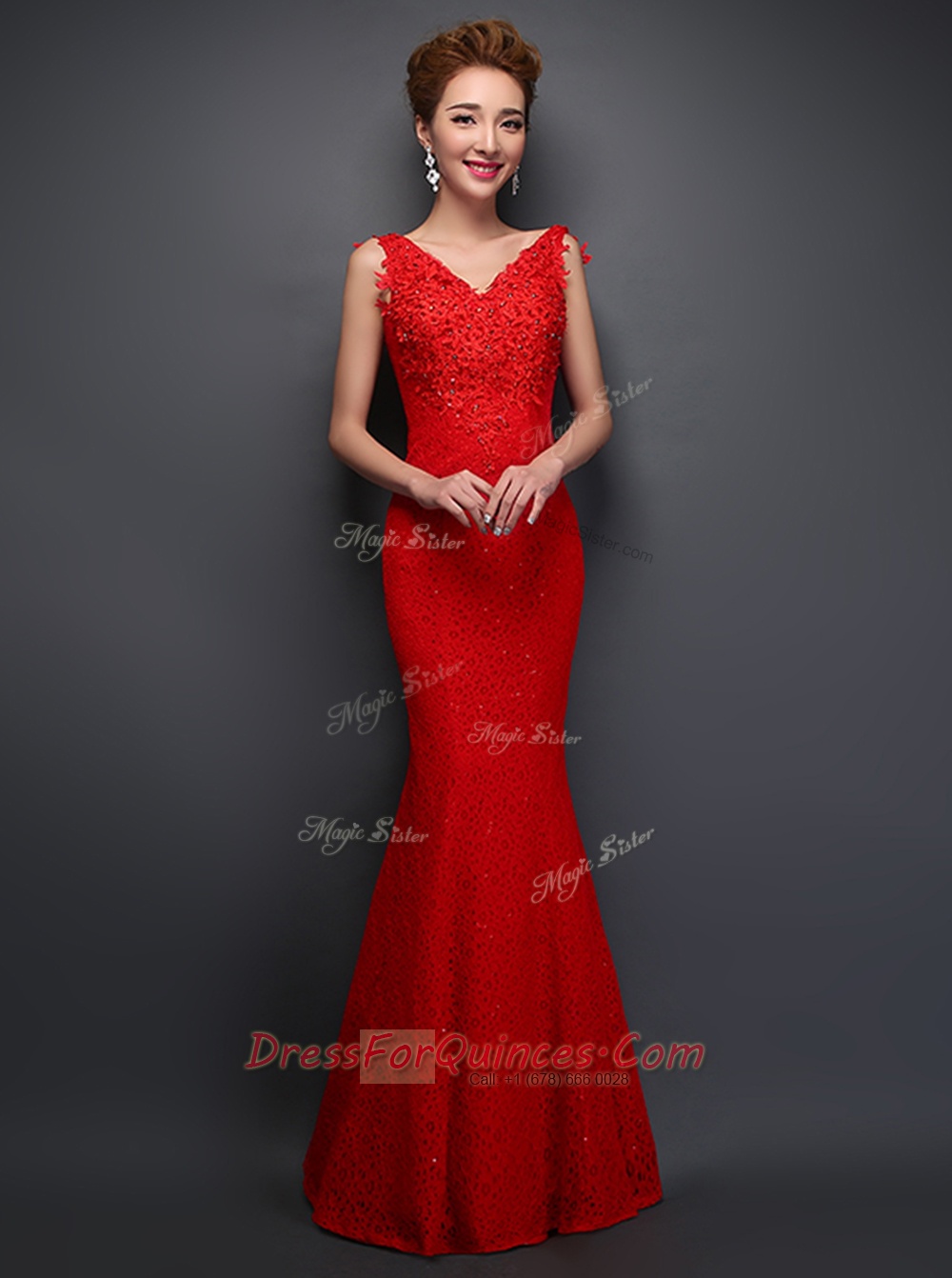 Simple Mermaid Lace V-neck Sleeveless Lace Up Beading and Appliques Evening Dress in Red