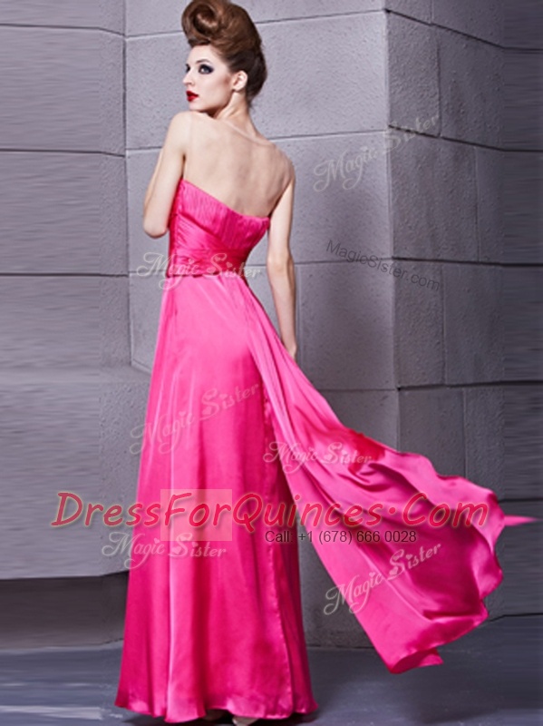 Sleeveless Elastic Woven Satin Floor Length Zipper Dress for Prom in Hot Pink with Ruching