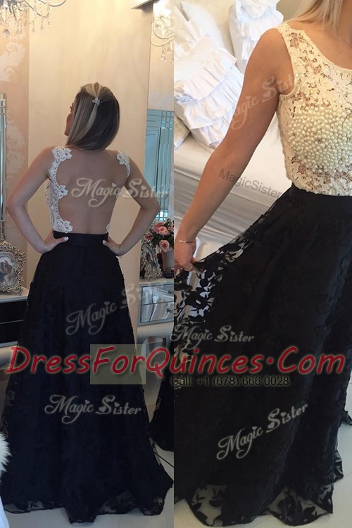 Sweet Scoop White And Black Lace Side Zipper Sleeveless Floor Length Beading and Lace