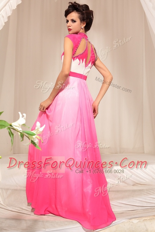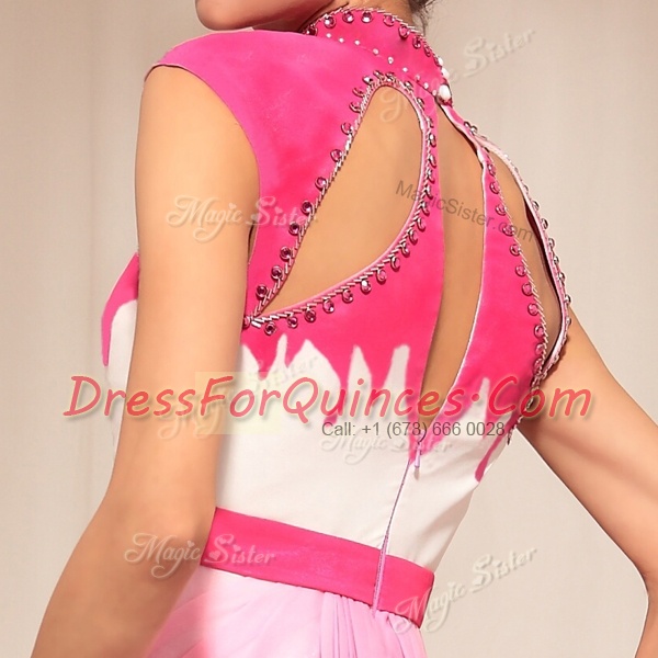 Vintage Hot Pink Chiffon Zipper High-neck Sleeveless Floor Length Beading