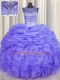 Delicate See Through Lavender Lace Up Quince Ball Gowns Beading and Ruffles and Pick Ups Sleeveless Floor Length