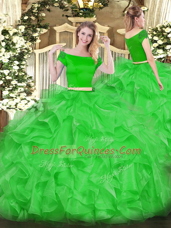 Discount Green Organza Zipper Quinceanera Gown Short Sleeves Floor Length Appliques and Ruffles